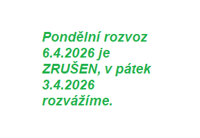 Rádi bychom Vás informovali, že rozvoz v pondělí 6.4.2026 je zrušen. Páteční rozvoz 3.4.2026 jsme pro Vás zachovali.